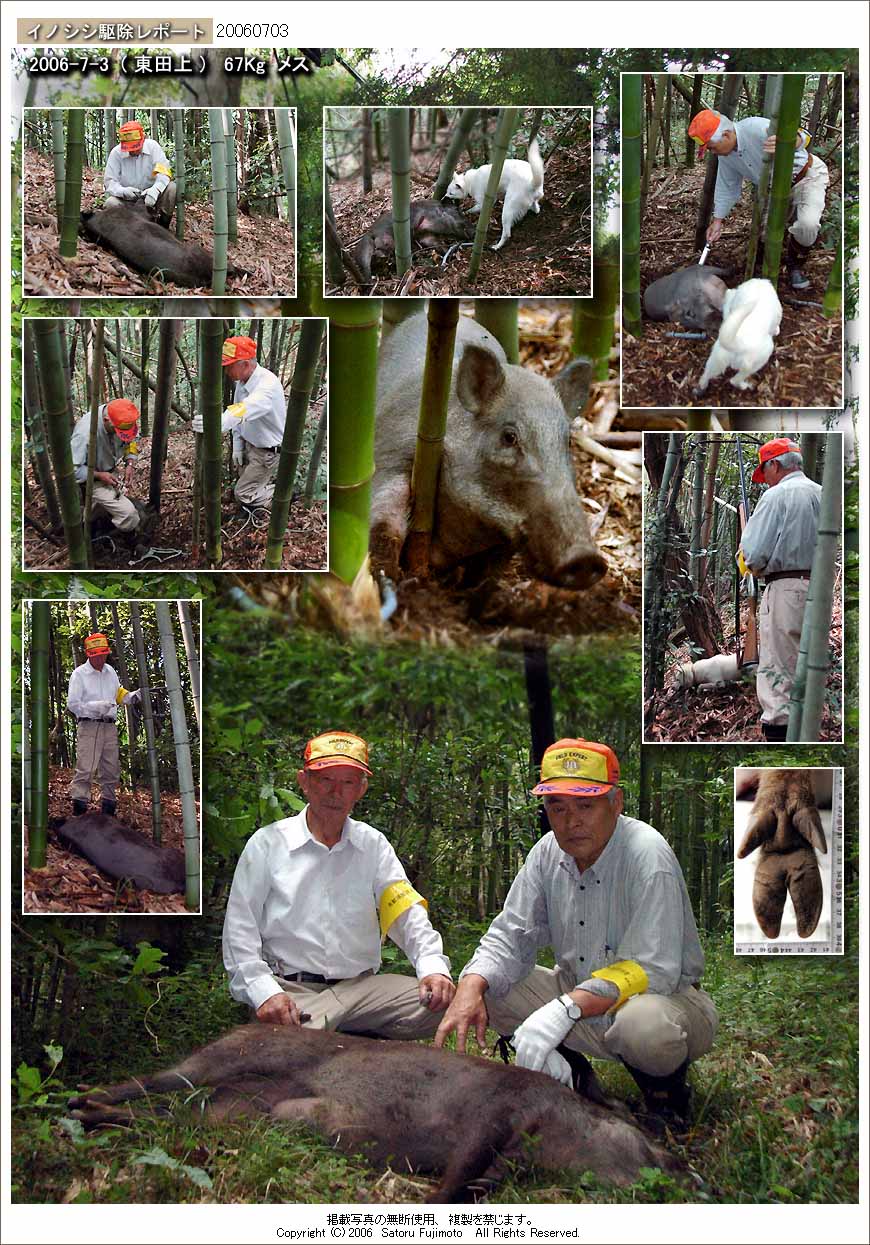 ●宇民さんによると、この付近では少し前に仕掛けておいた罠にカラ打ちがあり、再びイノシシが来るだろうとの読みが的中したという。猟友会会長の藤畠さんに連絡し確認記録した。今回は藤畠さんの猟犬(生後一年)を訓練のためにつれてきた。この犬にとっては初めて見るイノシシである。最初は犬もイノシシが怖いのか近づくのをためらっていたが、射殺後は、まるで野性の本能に目覚めたかのように噛み付いたりし始めた。こうしたプロセスを経て一人前の猟犬へと成長してゆくのだろう。