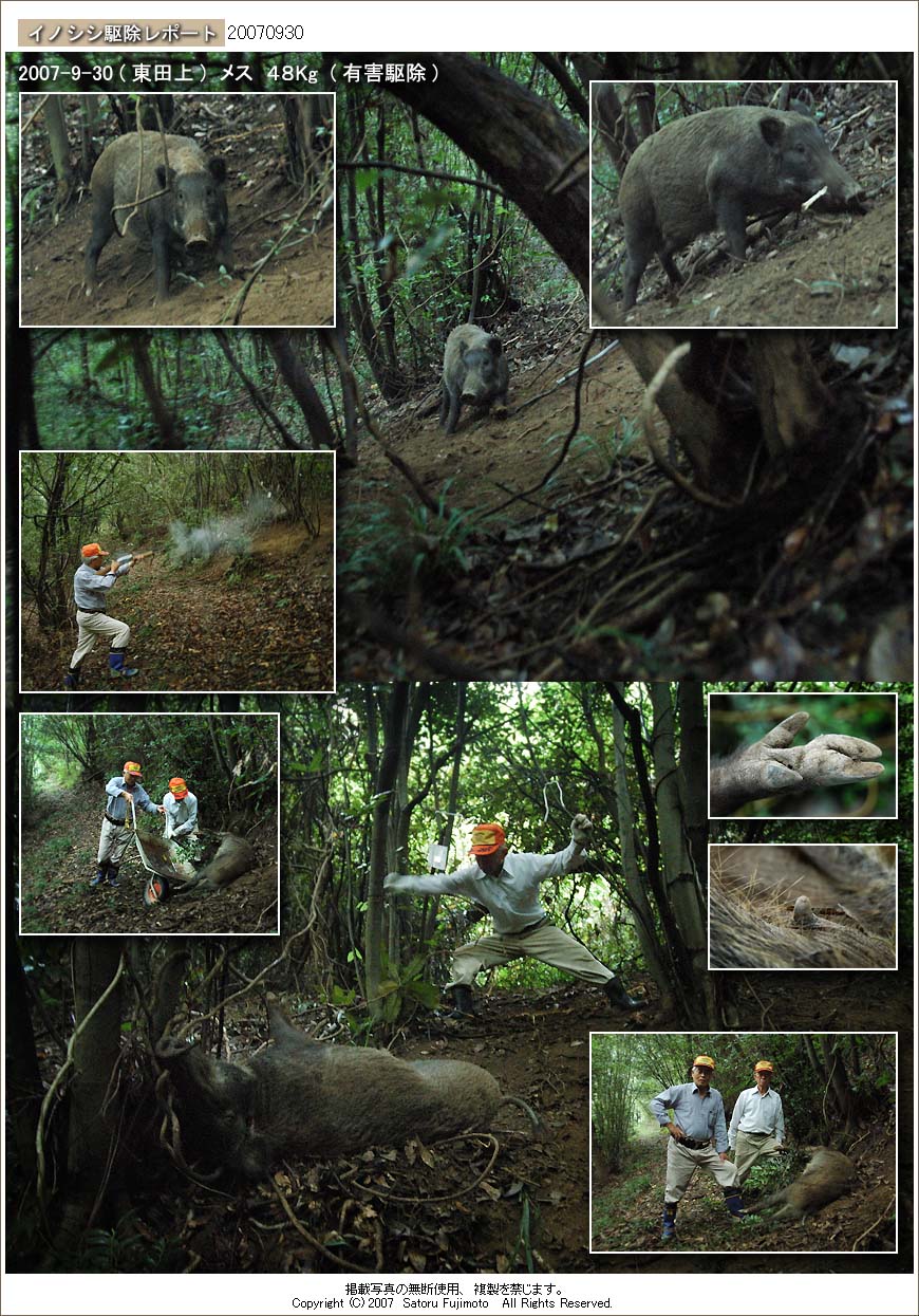 このイノシシ、やや大きめのメスで、乳首が3つほど肥大しているところを見ると、今夏に3頭出産しているのではないかと思われる。