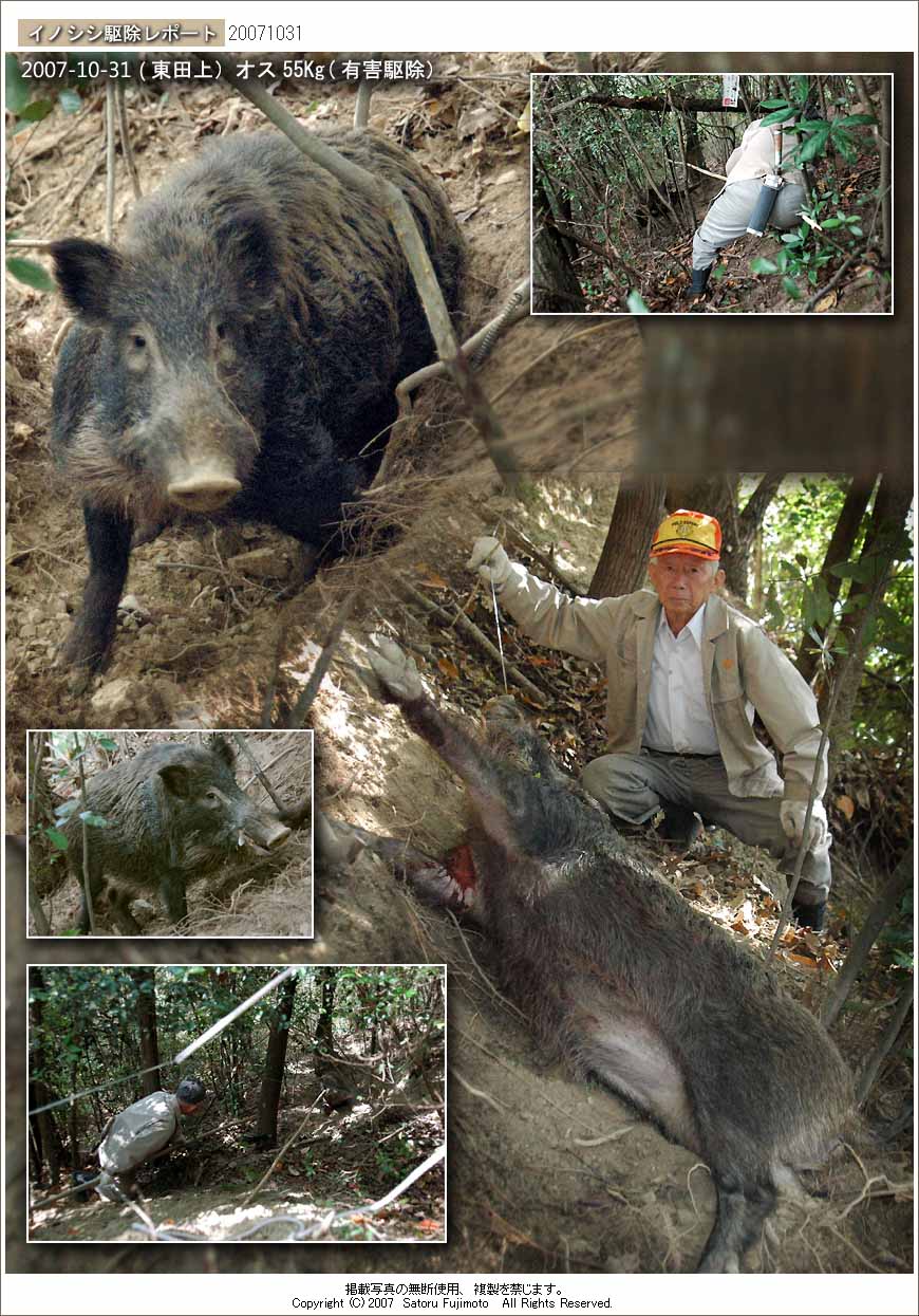 場所は東田上の八屋敷方面の雑木林の斜面。一ヶ月ぶりの捕獲となった、このイノシシ、今年になって宇民さんが捕獲したイノシシの中では最も大きい。 足場が悪く、ワイヤーでの固定に少し手間取ったが、止め刺しは一度で決まり、ロープと滑車を用いて上の道まで引き上げて回収した。