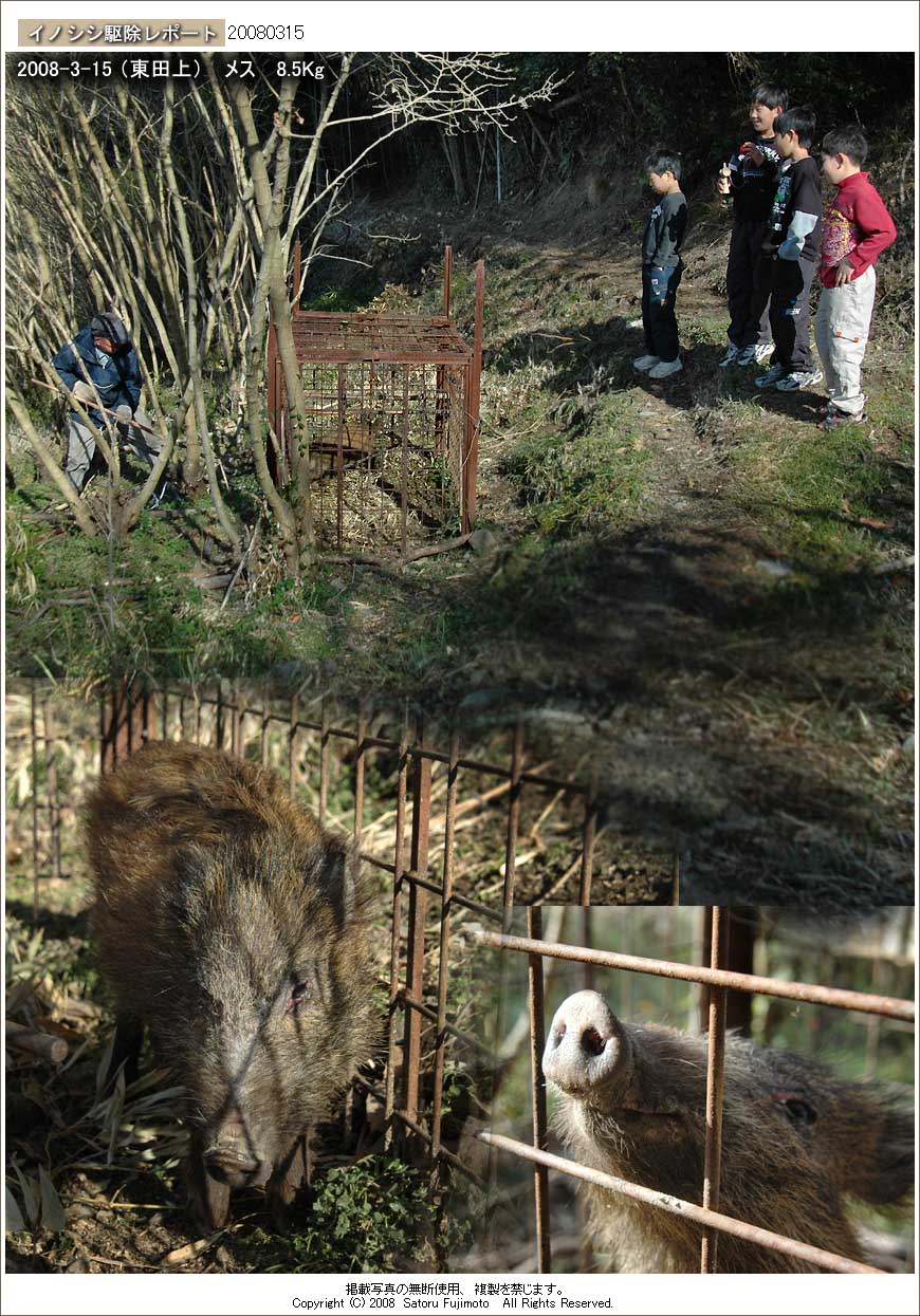 宇民家のすぐ裏にある桑畑に設置してある箱罠(檻)に小型のイノシシが入った。ごく最近まで、人家のすぐ近くまでやって来ていたイノシシだろうと思われる。