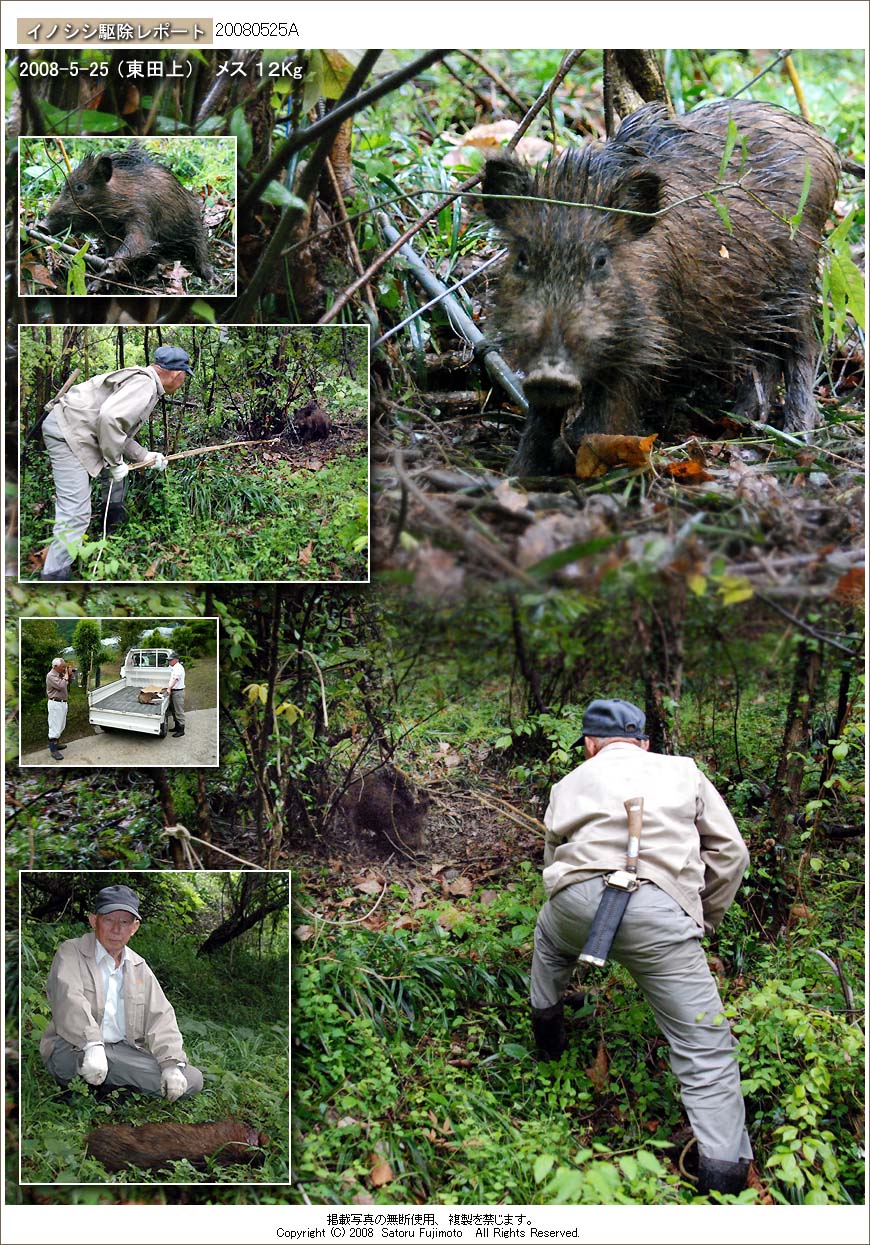 宇民さんが横井出用水路沿いの山の斜面に設置しておいたククリ罠による捕獲である。宇民家からは200メートル位離れているだろうか。早朝降った小雨のために濡れた草木の緑色が一層鮮やかに見える。ワイヤーとロープを用い、タテガミの濡れた小型イノシシの動きを抑えたあと、止め刺しで仕留めた。