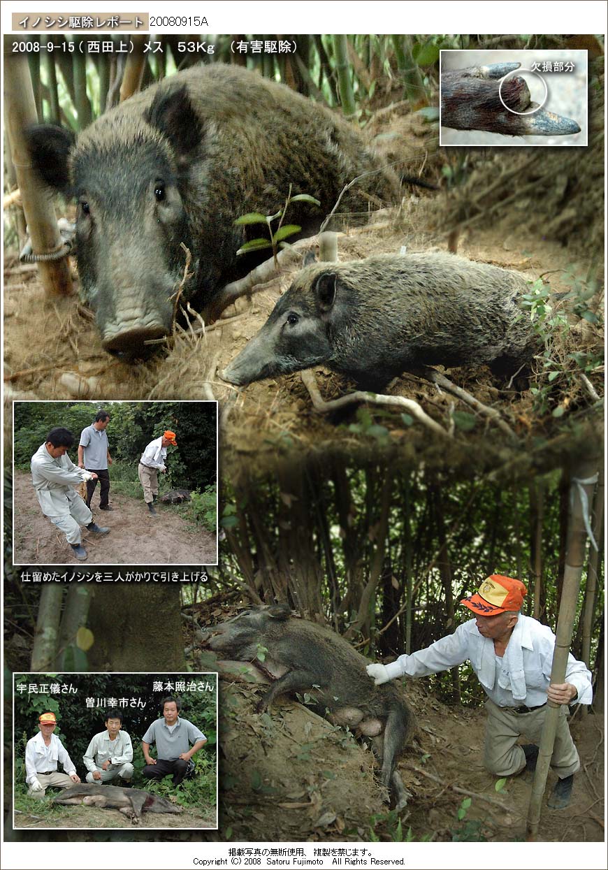 宇民さんが、先日、西田上地区に仕掛けておいたククリ罠にイノシシの親子が掛かった。宇民さんにとって西田上地区での捕獲は今回が初めてである。罠を設置したのが9月5日であるから、ちょうど10日で掛かったことになる。仕掛けた3箇所の罠全てに掛かっていたので一度に3頭の捕獲となった。