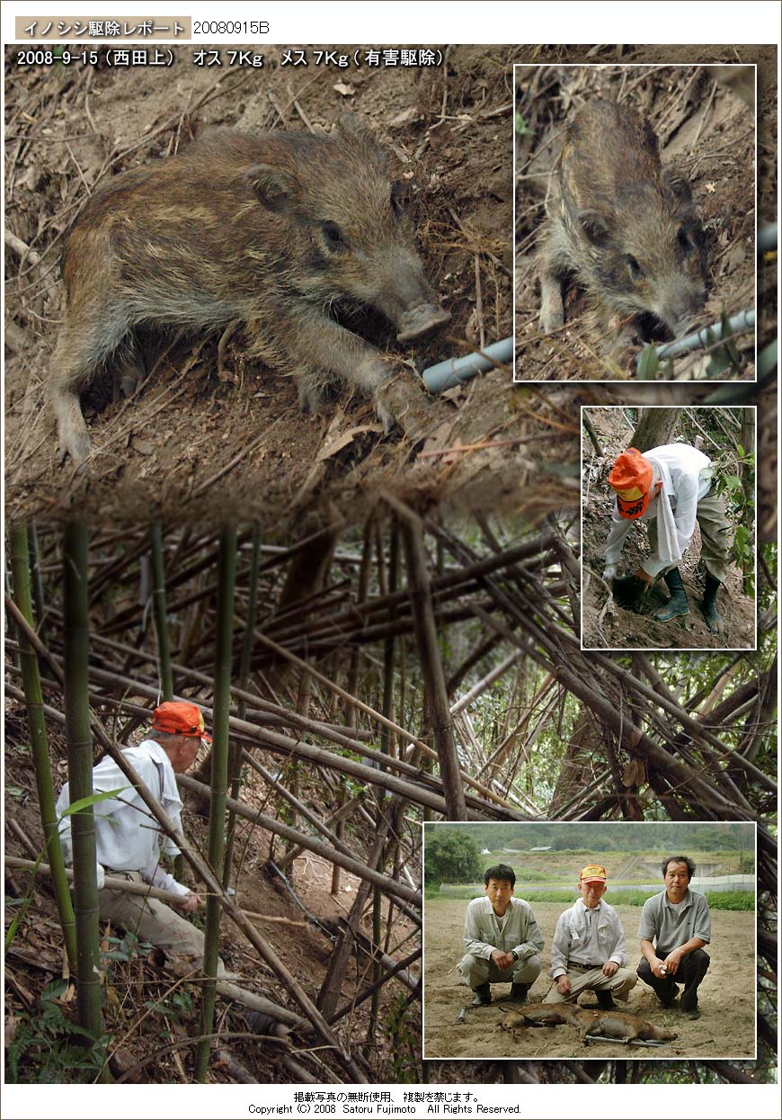 同時に捕獲された2頭の子供イノシシである。数メートルの距離をおいて掛かっていた。2頭共に僅かながらウリ坊の縞模様が残っている。おそらく今年の5〜6月頃に生まれた個体であろうと思われる。