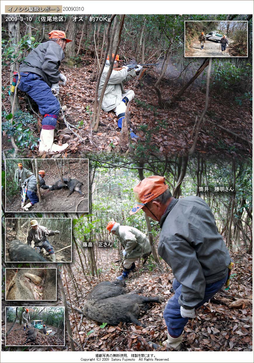 筒井さんが仕掛けた罠に大きめのオスのイノシシが掛かった。場所は田上地区の中心部から直線距離で1500メートル、黒北からは数百メートル程、東の位置にある佐尾地区。車一台が通れる位の細い山道から少し離れた比較的明るい林の中。