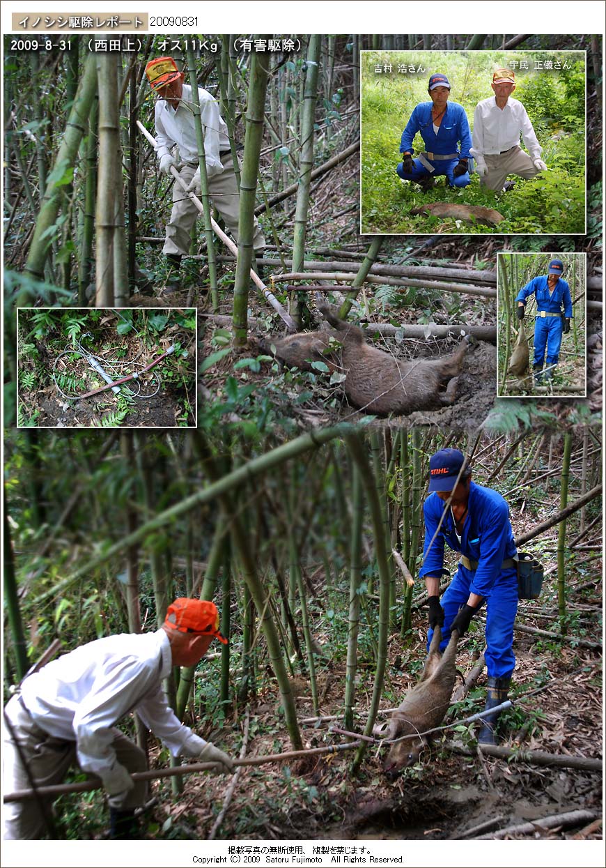 場所は、先月末に2頭同時に捕獲した場所 (捕獲写真20090731を参照)のすぐ上の斜面 。この辺りは古い水田跡地で、所々に ぬかるんでいる場所もあって、イノシシの好む環境となっている。
