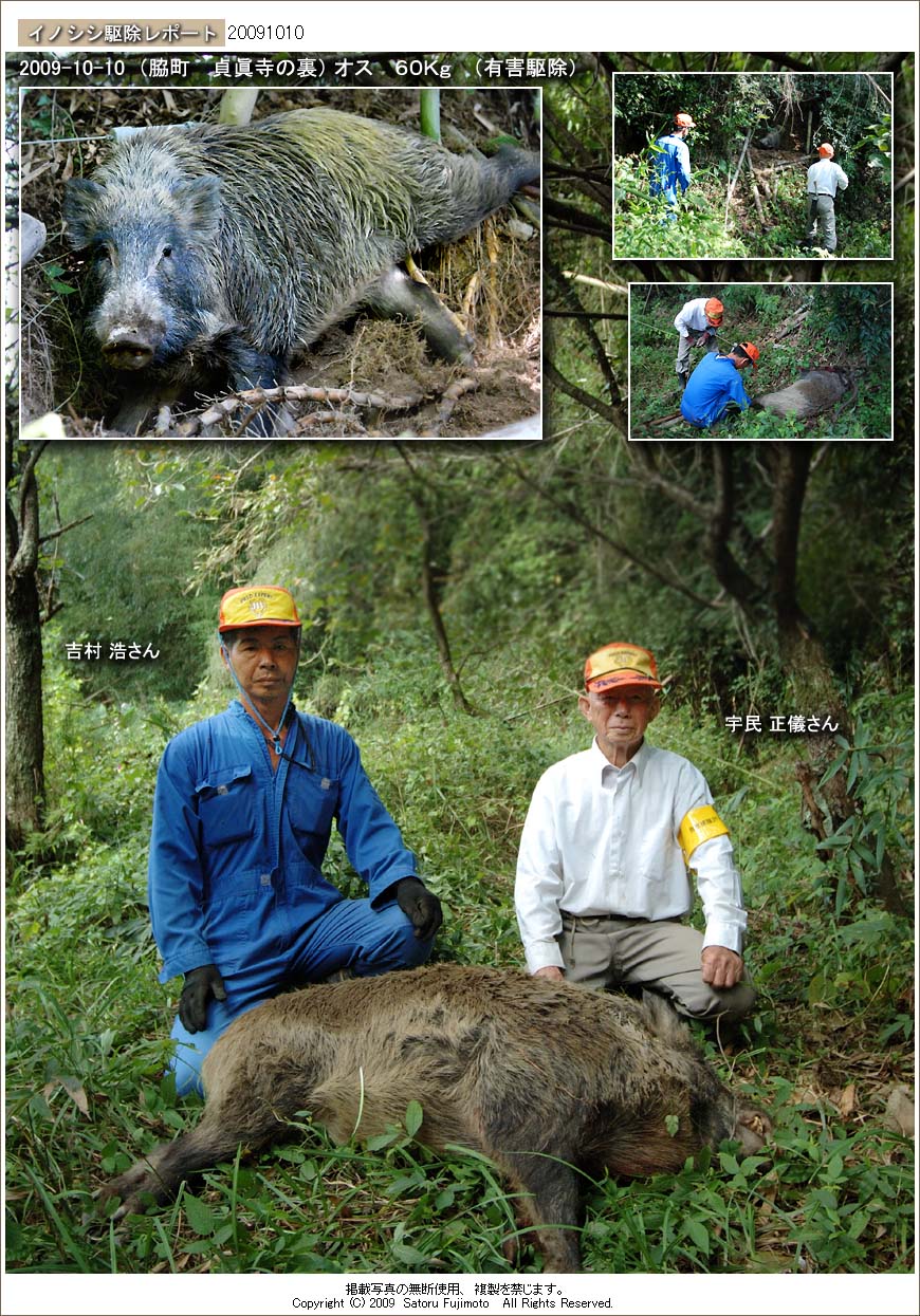近くにある水田はこれまでも何度かイノシシに侵入されており、このイノシシの仕業であった可能性が高い。回収後の計量では60Kgあり最近ではかなり大型のイノシシであった。