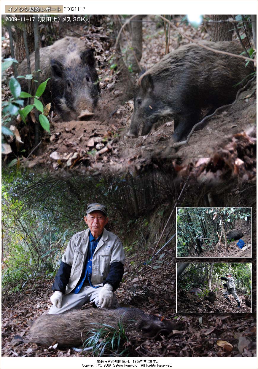 場所は東田上東部の八屋敷へと続く山道の入り口付近で宇民家からは100メートルも離れていない。このすぐ上には田上地区の上水道用貯水槽がある。この辺りでの捕獲は1年ぶり(前回の捕獲2008年10月6日)になる。