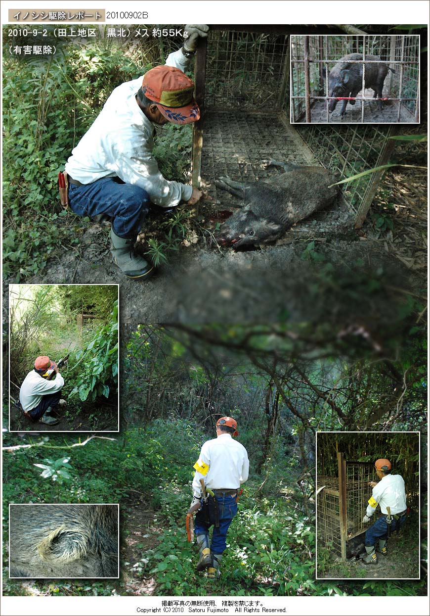 箱罠で捕獲されたのは50Kgを越えると思われるメスのイノシシ。生後1〜2年の若いメスのイノシシは母親と共に行動することが多いので、これら2頭は親子であった可能性もある。