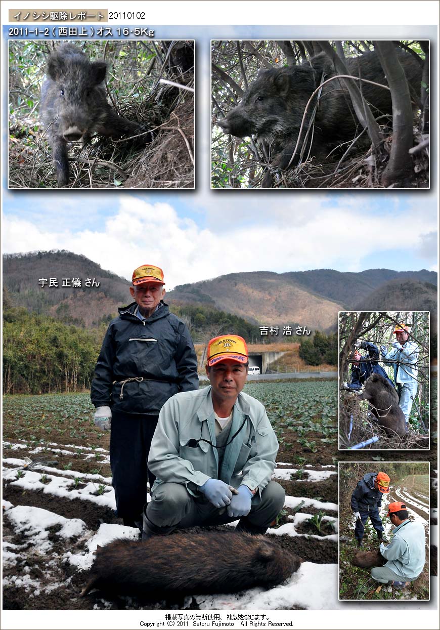 この辺りでは昨年秋に吉村さんが何頭か捕獲しているが、年末頃から再び2頭連れの小型のイノシシが出没し頻繁に目撃されていた。
