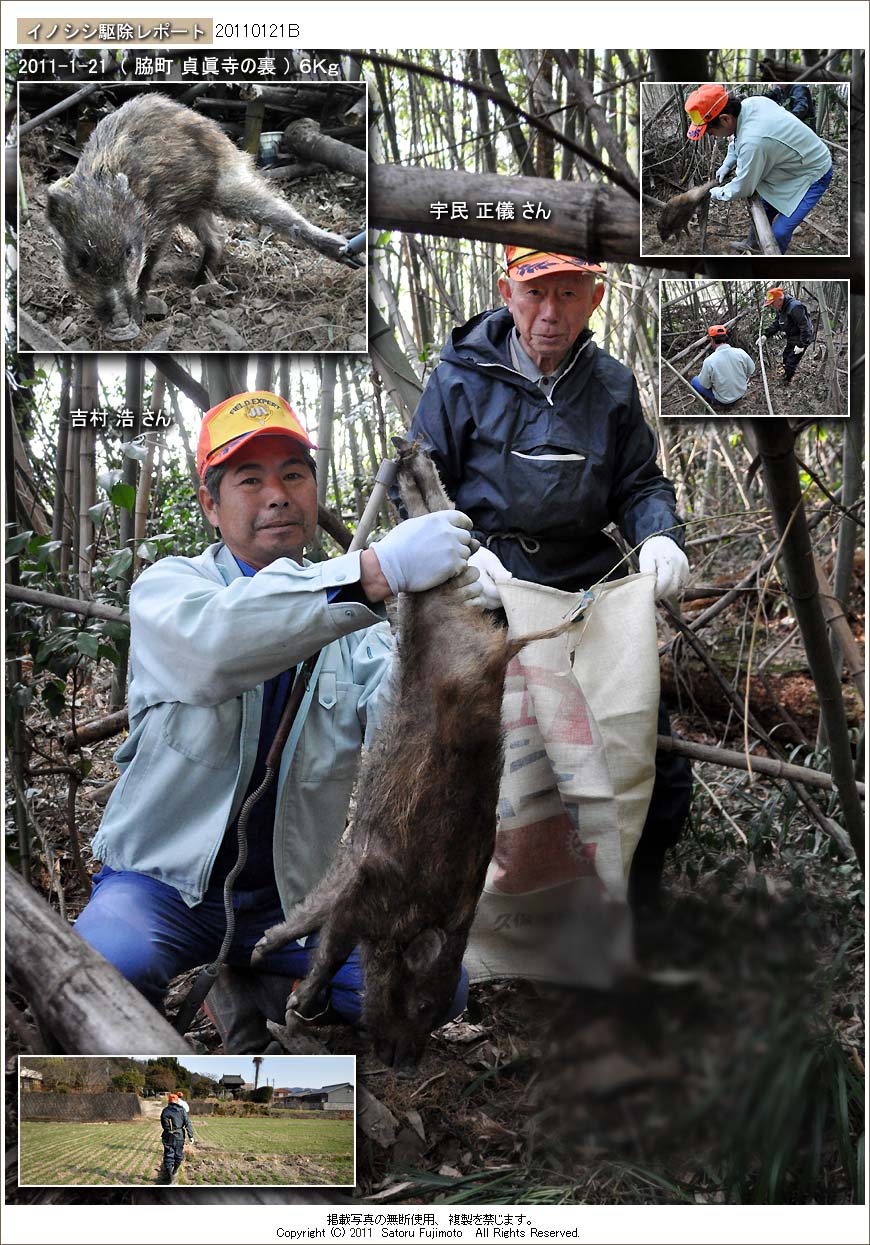 吉村さんの罠に掛かったのは、わずか6キロの子供のイノシシ。今猟期に入って間もなく、今回とよく似た小型のイノシシを直ぐ近くで捕獲しているので、その個体と兄弟であった可能性がある。しかしこれらのイノシシの親らしい個体はまだ捕獲されていない。