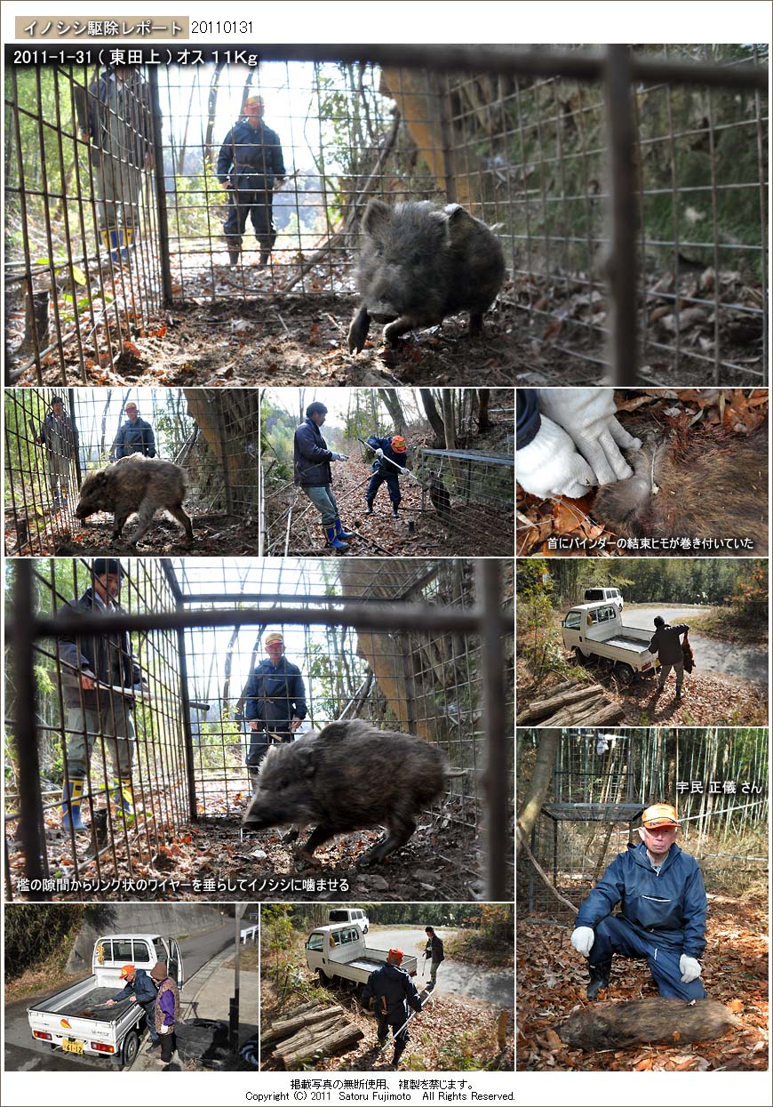捕獲されたイノシシは小型のイノシシで首にバインダー用の結束ヒモが食い込んでいた。今よりもっと小さかった頃に、刈り取り後の水田などで偶然首に入ってしまったのだろう。