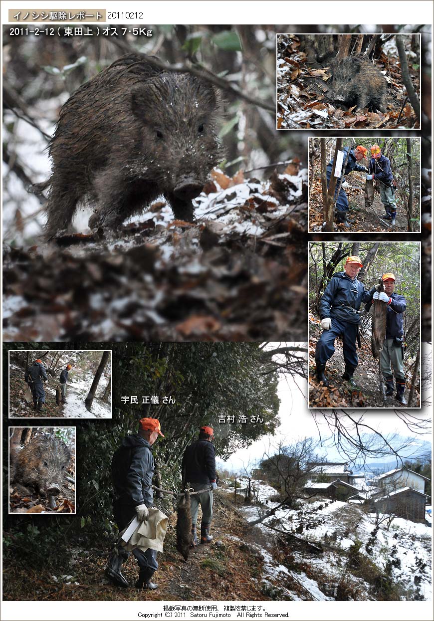 宇民さんの罠に掛かったイノシシは7Kg程度と小型であるが、ウリ坊の縞模様は完全に消えていて昨年の夏の終わりから秋にかけて生まれた個体と思われる。この辺りではこのサイズのイノシシは他には捕獲されていないので今後同様のサイズのイノシシが掛かる可能性が出てきた。