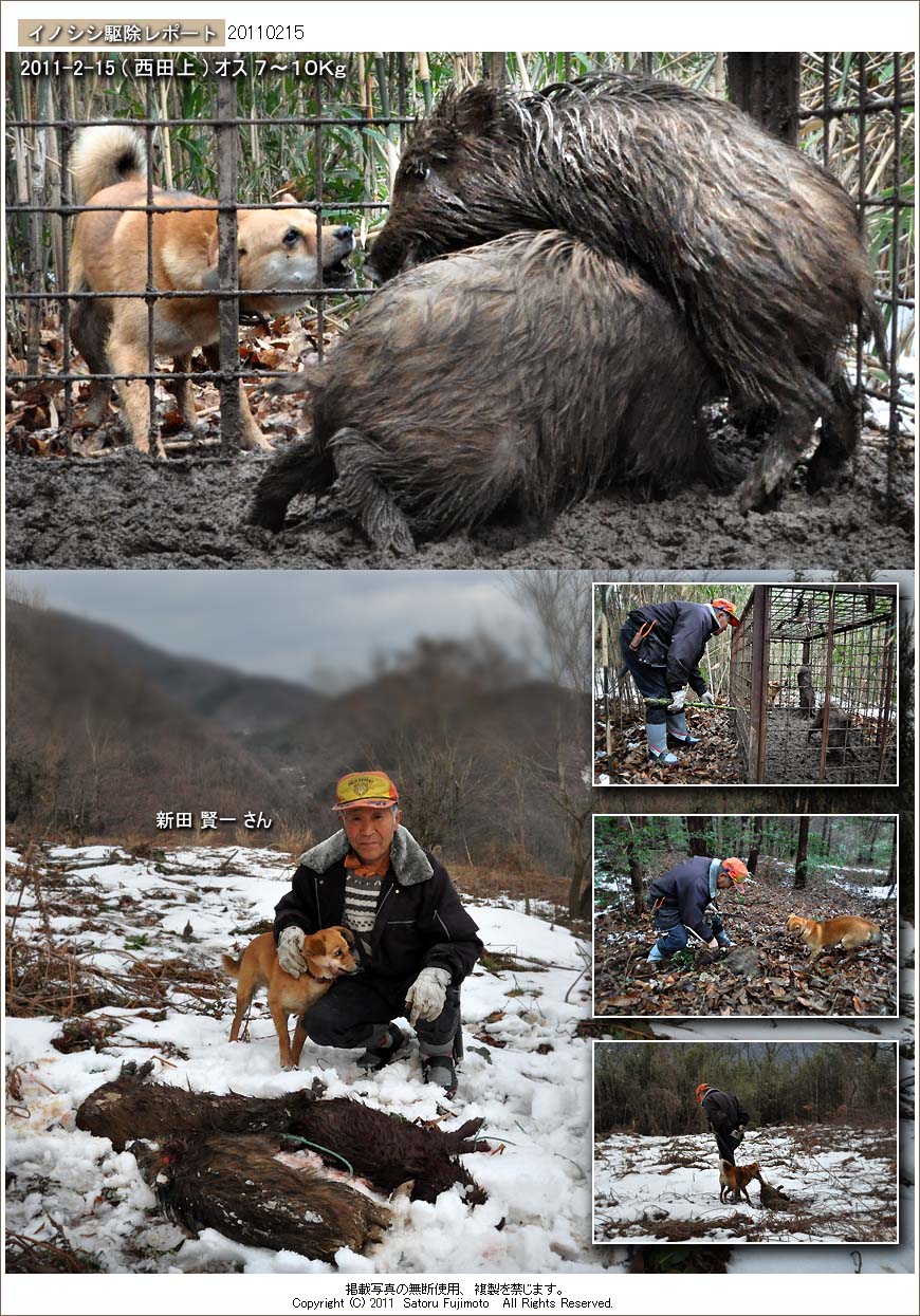 場所は西田上の眞楽寺裏にある塩ガ峰の中腹である。新田さんは ここに箱罠とククリ罠を設置していて、今回は箱罠で2頭、近くのククリ罠で1頭が掛かっていた。3頭共に小型のオスで兄弟の可能性がある。この箱罠では先月にも今回とよく似たサイズのイノシシを捕獲している。(捕獲写真20110121A参照)