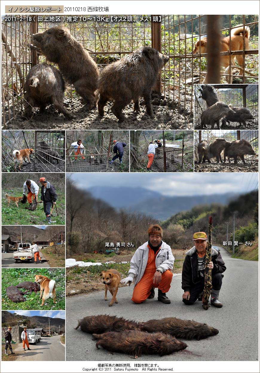 場所は西條牧場である。今回は一度に3頭の小型イノシシが入った。この箱罠は設置場所の直ぐ側にイノシシの棲む山があり、コンスタントに捕獲実績をあげている。昨年の11月から、今回で4度目の捕獲となるが、1頭を除いては全て10キロ前後の幼獣である。今の時期はイノシシの発情期であるため、成獣は山中に潜んでいて人里にはあまり出てこないのだ。