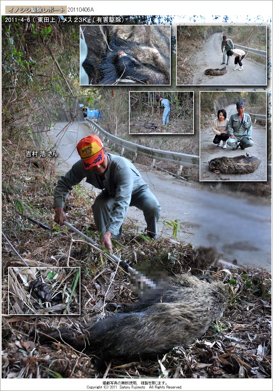 背景は東田上の集落から少し外れた黒北谷に近い道路上。 この近辺では昨年に多くのイノシシが捕獲されている。 今回、捕獲されたイノシシは前足が大きく欠損していた。かなり上部から切断されていることから以前に引きバネ式のククリ罠に掛かったことがあるのだろう。 体力が落ちているらしく痩せていて体中に大量のダニが付着していた。