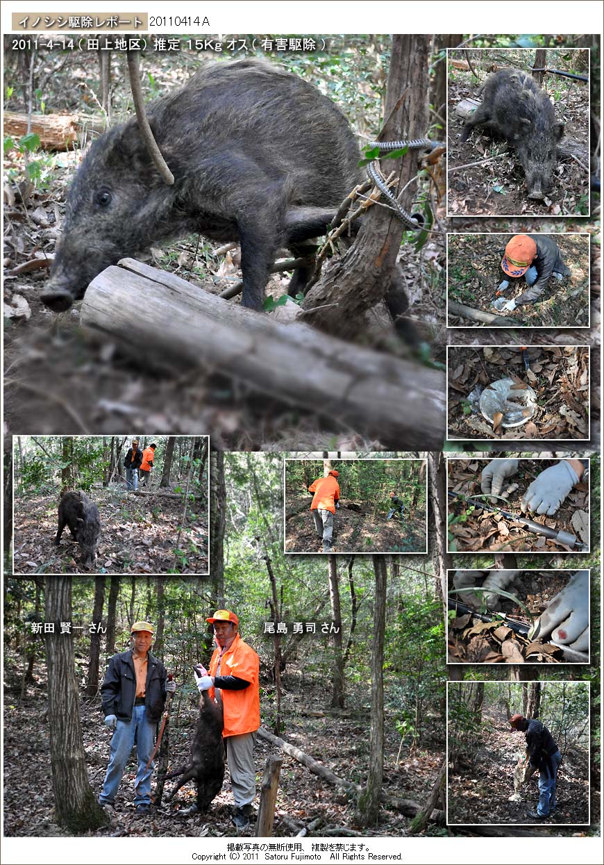 昨日に続いて今回も黒北である。国見丸の山裾にある比較的明るい林の中にイノシシ道が通っていて、昨日の捕獲場所からは100メートル程離れている。新田さんは場所に応じて罠の使い分けをしていて、昨日は引きバネ式であったが、今回のイノシシは押しバネを使った踏み込み式のククリ罠に掛かっていた。捕獲されたイノシシは小型のオスでサイズもよく似ている。