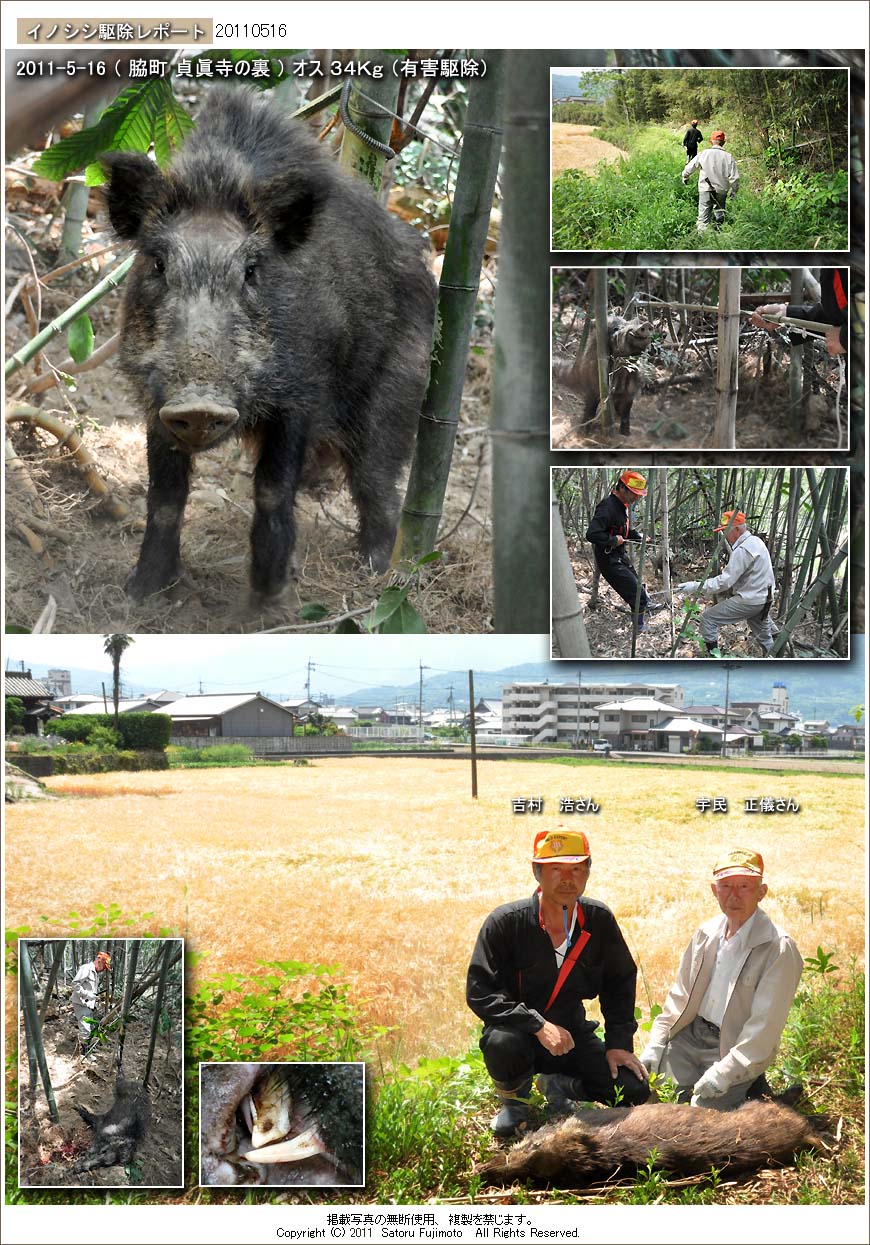 脇町の秋葉公園に近い貞眞寺の裏の竹藪である。吉村浩さんのククリ罠に掛かったのは34Kgの中型のオス。罠に掛かってから少し時間が経っているらしく、罠のワイヤーに捉えられた右後ろ脚が骨折し骨の一部が露出していた。