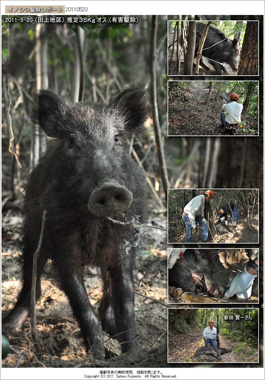 今回は、引きバネ式のククリ罠が用いられた。通常は前後どちらかの脚が掛かるのだが、珍しくイノシシの鼻先がワイヤーに掛かっていた。そのため全ての足が自由に動かせる状態になり、ワイヤーの遊びの範囲内を勢いよく走り回っていた。イノシシは中型のオスで、4日前に吉村さんが貞眞寺の裏で捕獲した個体と極めてよく似ていた。