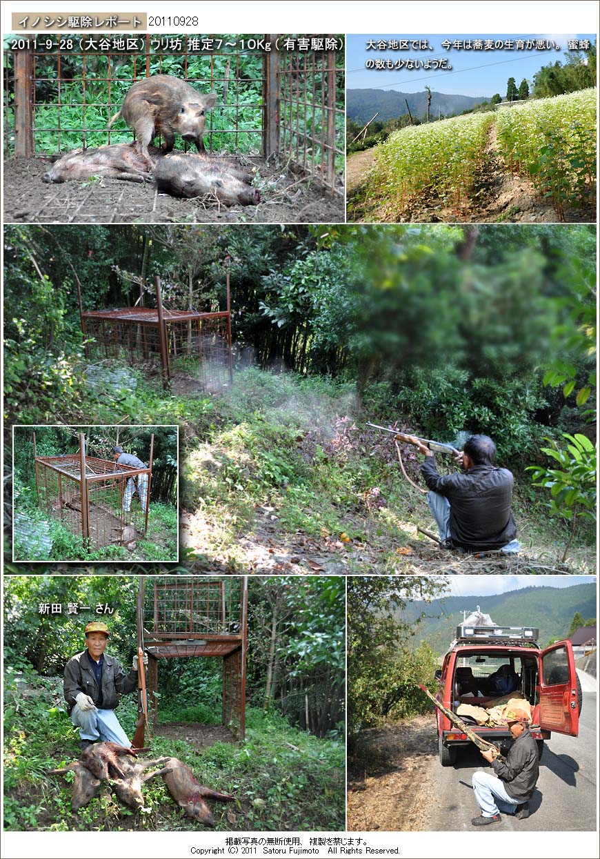 新田さんが大谷地区に設置しておいた箱罠である。この箱罠を設置してから約1年が経過するそうだが捕獲は今回が初めてだ。捕獲されたのは4頭のウリ坊でそのうち1頭は扉に挟まれるような形で既に死んでいた。 新田さんが檻の中のイノシシが重なった瞬間を狙って2頭を銃で仕留め、残り1頭は槍を用いて止め刺しで処理した。