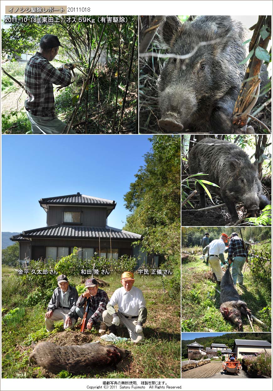 射殺後にイノシシを人家の庭まで引き出し、回収にはトラクターを用いて吊り上げたまま宇民家まで運んだ。計量の結果は59Kgと予想より少し軽かったがそれでも、東田上地区内で捕獲したイノシシの実測値としては1年ぶりの大物だ。