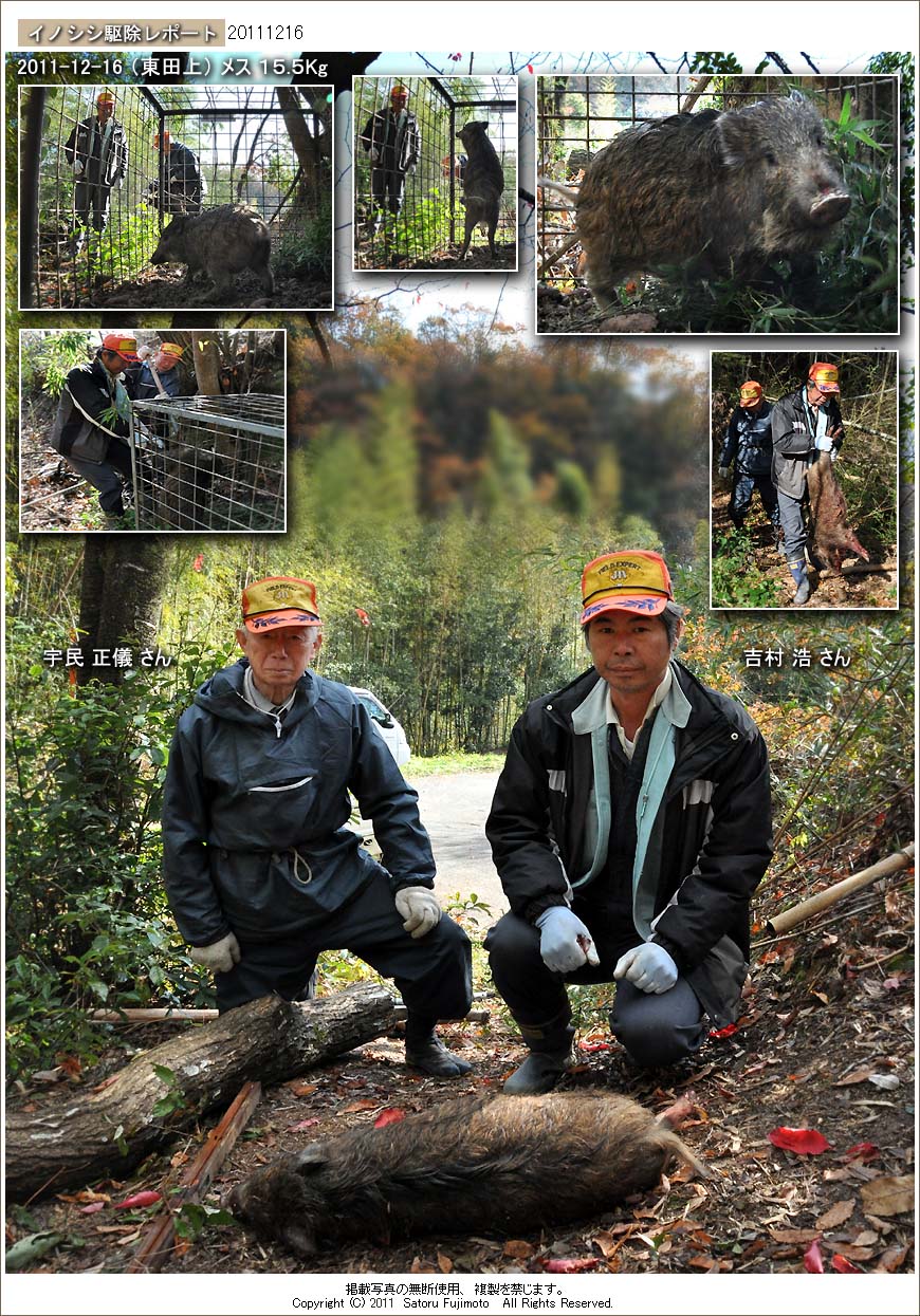 東田上東部の市道沿いの竹藪に設置された箱罠である。この箱罠による捕獲は今回で3度目になり、今年の4月23日以来8カ月ぶりだ。いずれも小型であったが、この箱罠は強度面で問題があるため、イノシシが大型であるよりも逆に小さい方が安心だ。