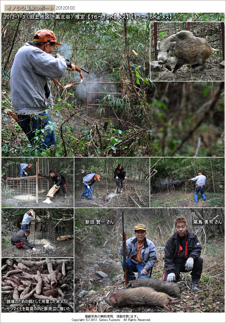 もう一方の箱罠は、300メートル程下った谷沿いにあり、設置してから1年半になるが今回で2度目の捕獲だ。いずれも20Kgに満たない小型のイノシシで昨年の春〜夏に生まれた個体だろう。