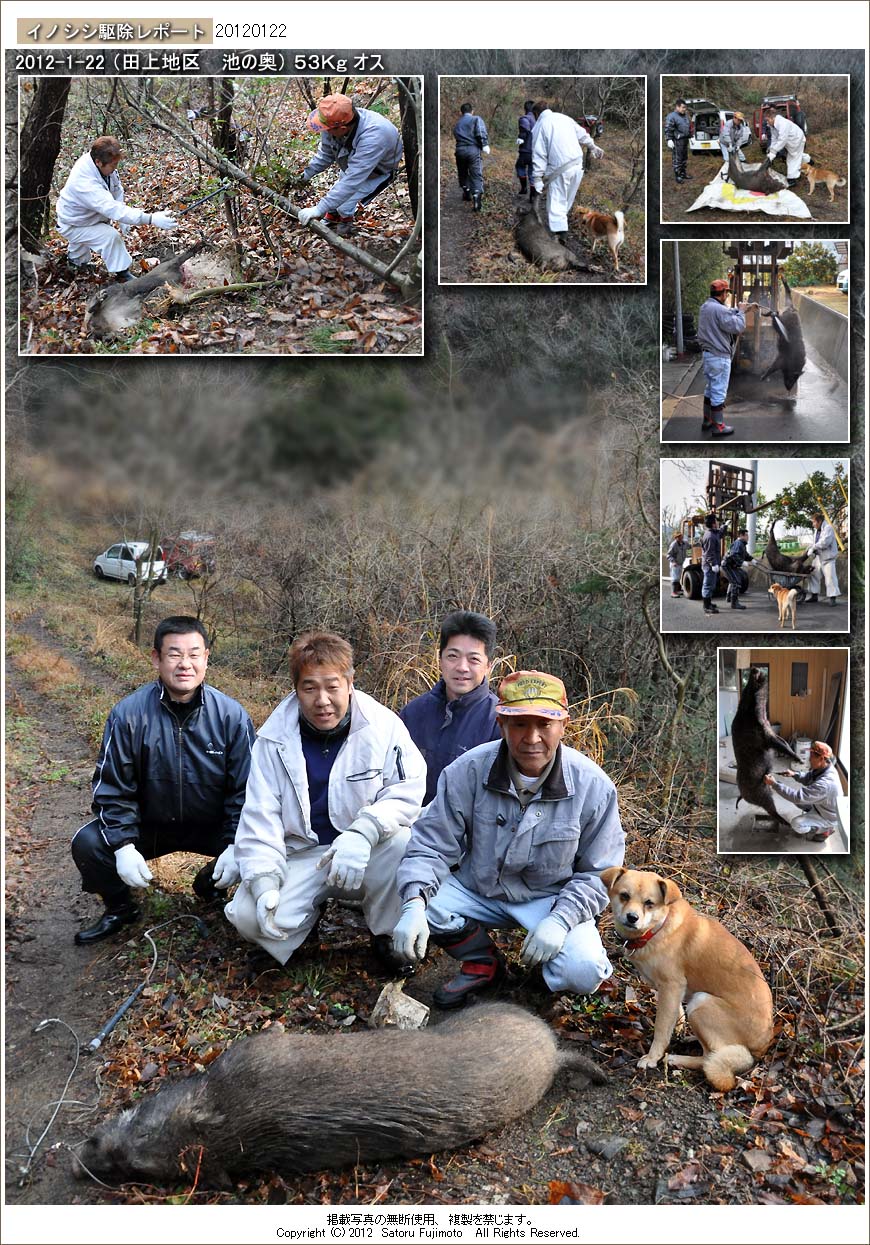 連絡を受け現場へ同行した尾島さんら3人が引きずって斜面から下ろし車に乗せて搬出し、新田家の片隅にある完成間近の解体場へ運び込んだ。計量の結果は、予想より少し軽い53Kgであった。