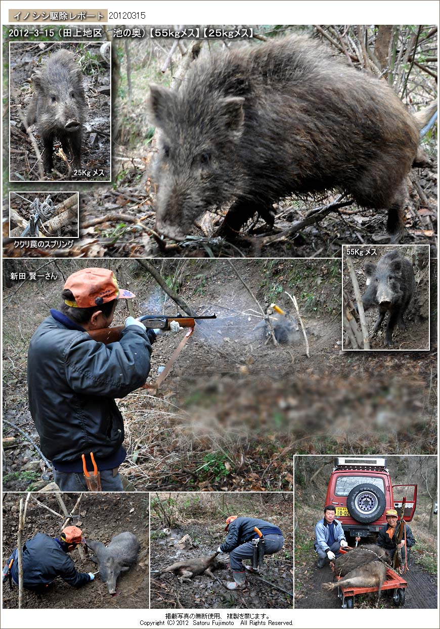 箱罠の少し先の山裾に、数メートル間隔で仕掛けられていた2つの罠に親子と思われる大小2頭のメスのイノシシ(55Kg、25Kg)が掛かっていた。イノシシのメスはある程度成長しても母親と行動を共にすることが多い。このため次々に掛かってしまったのだろう。
