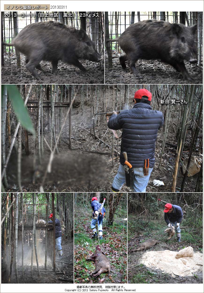 黒北に設置された箱罠である。この檻では3カ月前にも1頭捕獲している。新田さんがメッシュ越しに射殺し、ロープを使用し、車を駐めた場所まで運び出した。箱罠の近くにある泥濘には真新しい足跡がついていて、他にもイノシシが生息していることを示している。 一見すると20Kgに満たないようにも見えたが、回収後に計量したところ23Kgあった。