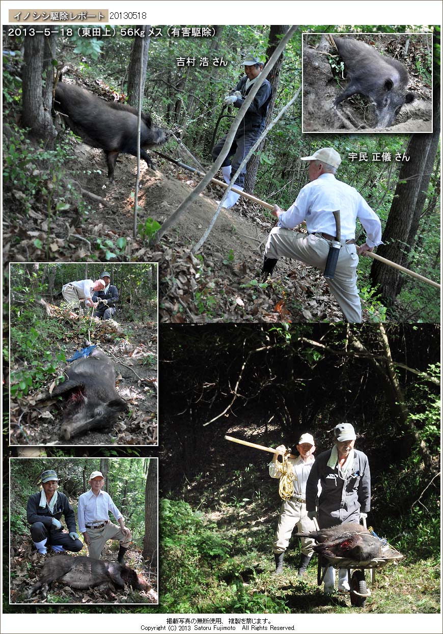 一見すると40キロ半ば程度に見えたが、滑車を用いての回収時、ロープを引く吉村さんの手にはずっしりとした重みが感じられたと言う。宇民家での計量でも56sと予想を上回っていて、更に解体の結果、かなり成長した5頭の胎子が確認された。