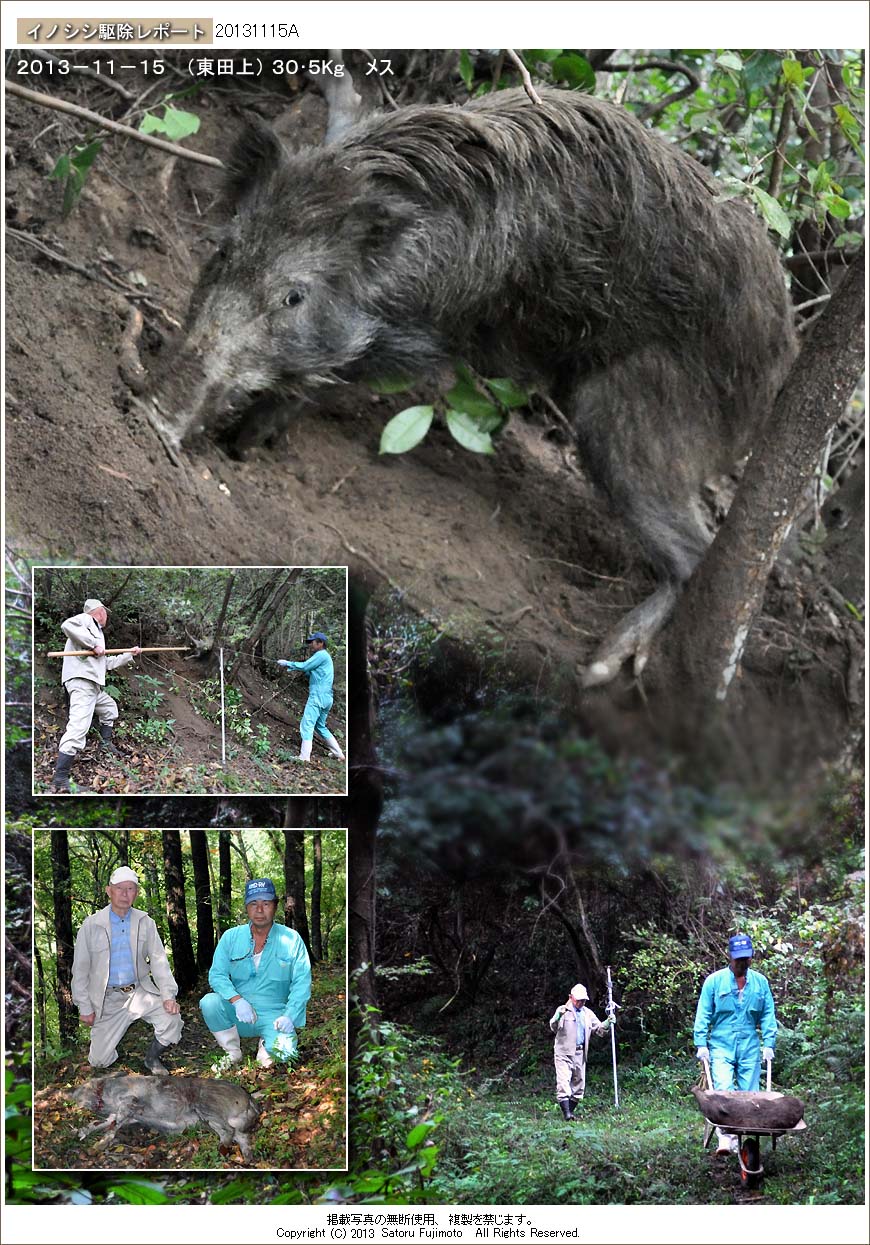 宇民家から200メートル程離れた横井出の山道のすぐ上に仕掛けておいたククリ罠に中型のメスが掛かった。ここでは先月に有害駆除として1頭捕獲したが回収時には既に死んでいた。