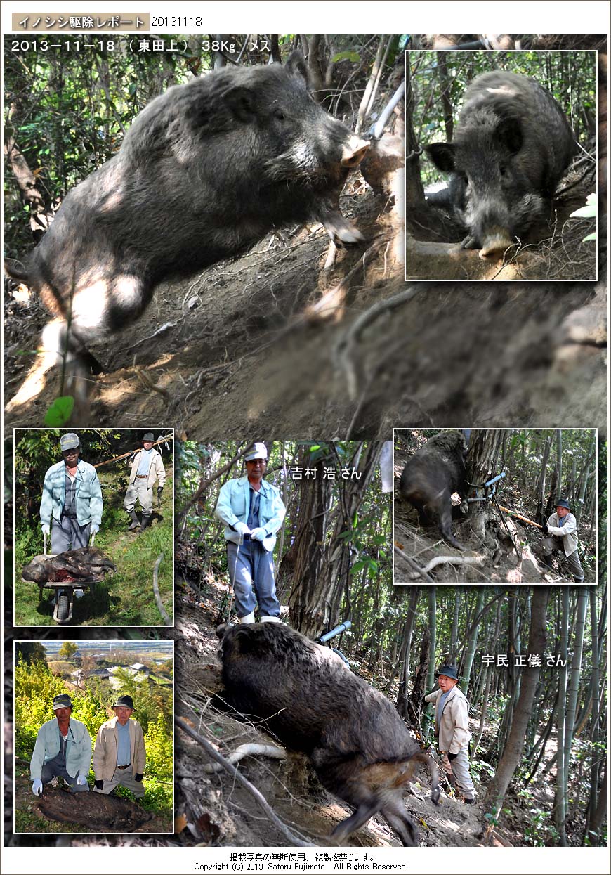 吉村さんがワイヤーでイノシシの口を縛り宇民さんが止めを刺して処理した。現場で見た時には、昨日のモノより大きく見えたが、回収後の計量結果は38Kgに留まり一歩及ばなかった。
