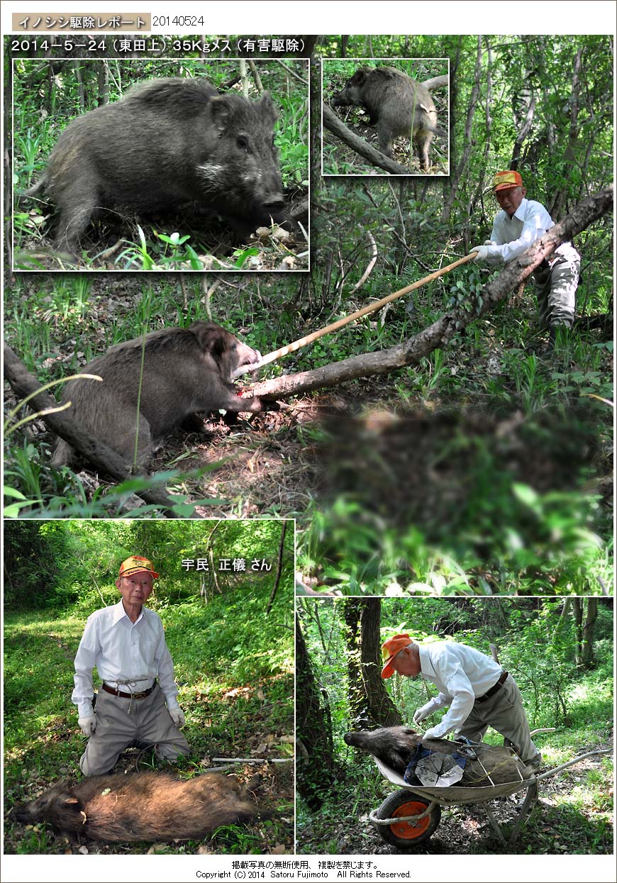 横井出の山道沿いの雑木林に仕掛けられた罠に掛かっていたのは35Kgの中型のメスで昨年の12月16日以来、約半年ぶりの捕獲になる。このイノシシの首には細いナイロン製のヒモが巻かれていてその一部がイノシシの首に食い込んでいたことから、昨年の秋に西田上や東田上で目撃されたイノシシのようだ。当時は20Kgに満たない個体が8ヶ月でほぼ2倍に成長していたことになる