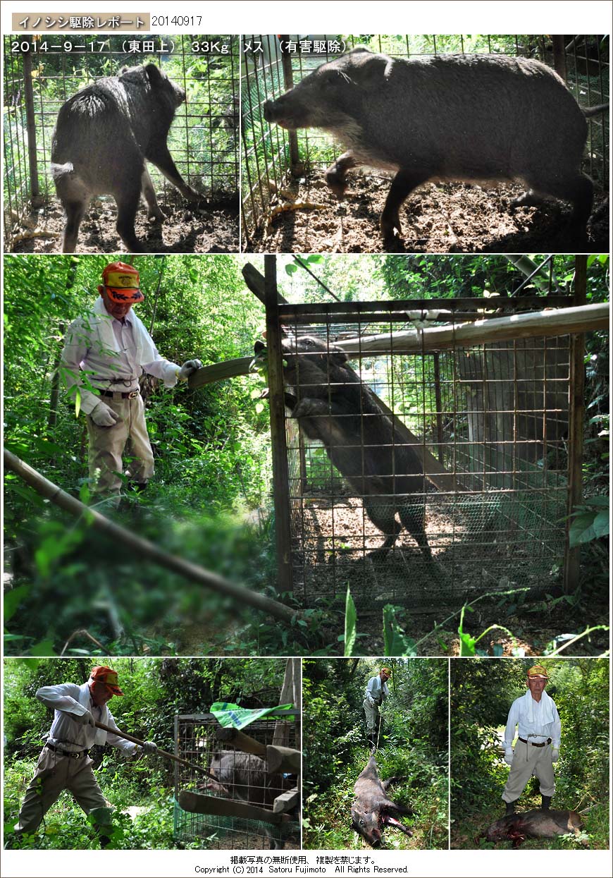 東田上東部の市道・脇町185号沿いの竹藪に設置している箱罠である。この箱罠による捕獲は2011年12月16日以来であるから実に2年8ヶ月ぶりだ。イノシシは中型のメスで檻の中を動き回っていた。