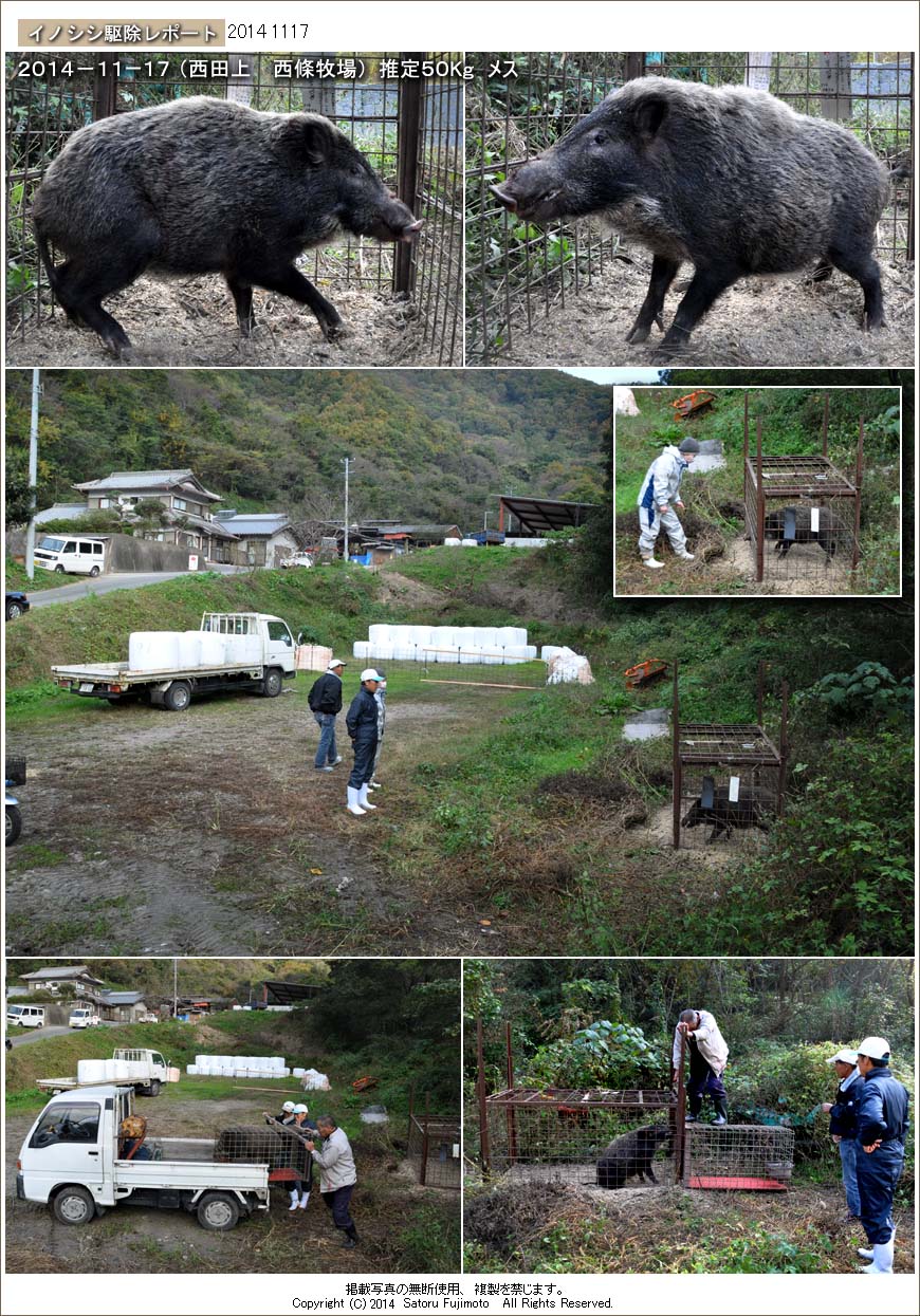 およそ50s程ありそうなメスで、ここで捕獲したイノシシでは最大らしい。イノシシは未明から早朝に入ったようで、発見時には檻の側に別のイノシシの姿があったという。