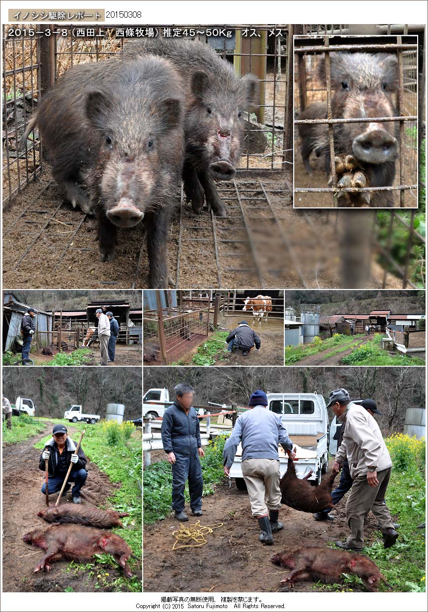 牧場の牛舎の側で新田さんの箱罠に2頭のイノシシが入った。以前から牛舎近くにはイノシシが頻繁に来ていたため、すこし前に箱罠を此処に移設していたのだ。 箱罠から数メートルの距離にいる乳牛を驚かせないように仕留め作業は槍を用いて行ったが、銃と違って時間がかかり、槍の柄が折れるというハプニングに見舞われた。
