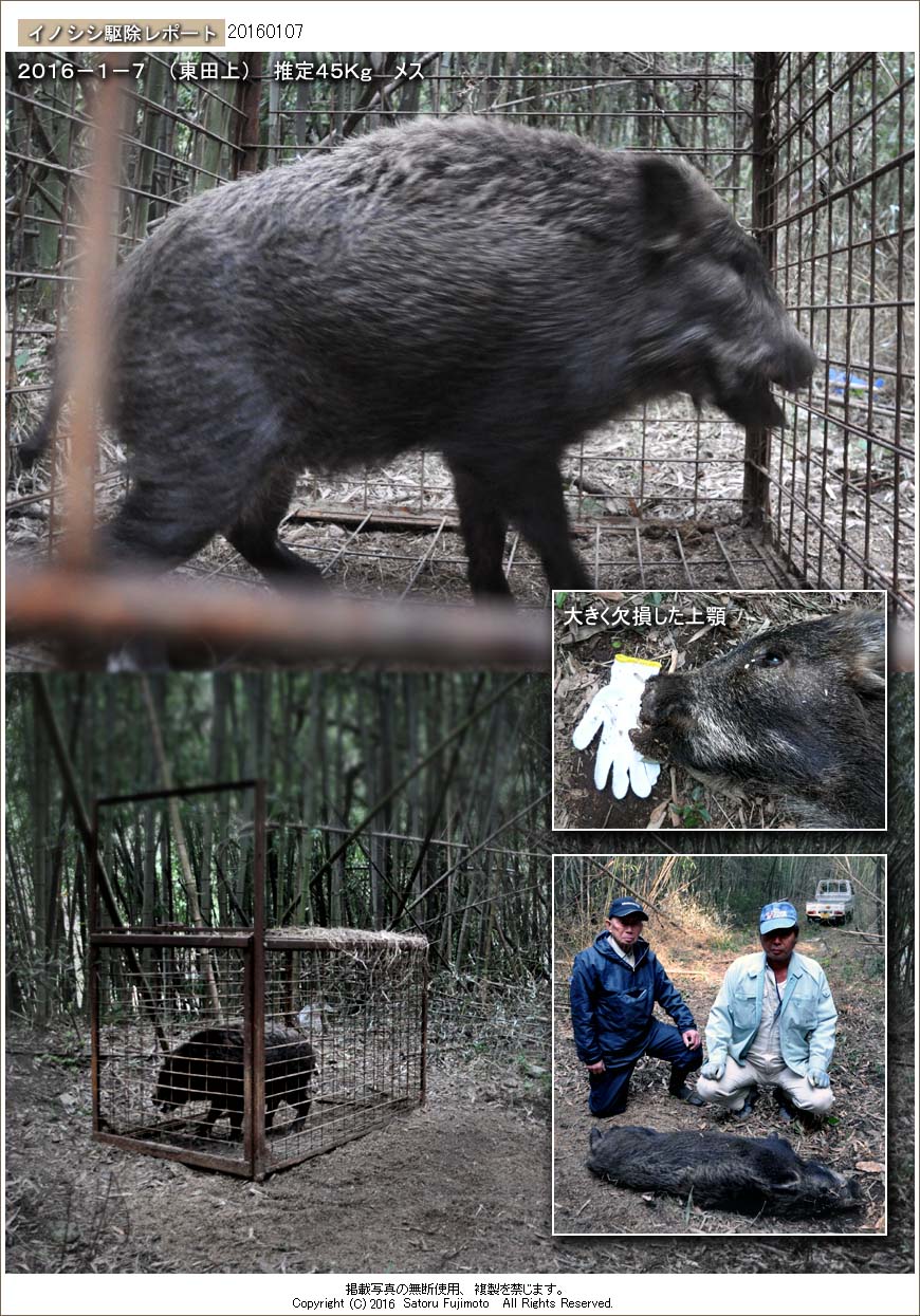 吉村家の裏の竹藪に設置した箱罠に中型のイノシシが入った。この箱罠は吉村さんが自作したモノで、一週間前に餌を入れていた。