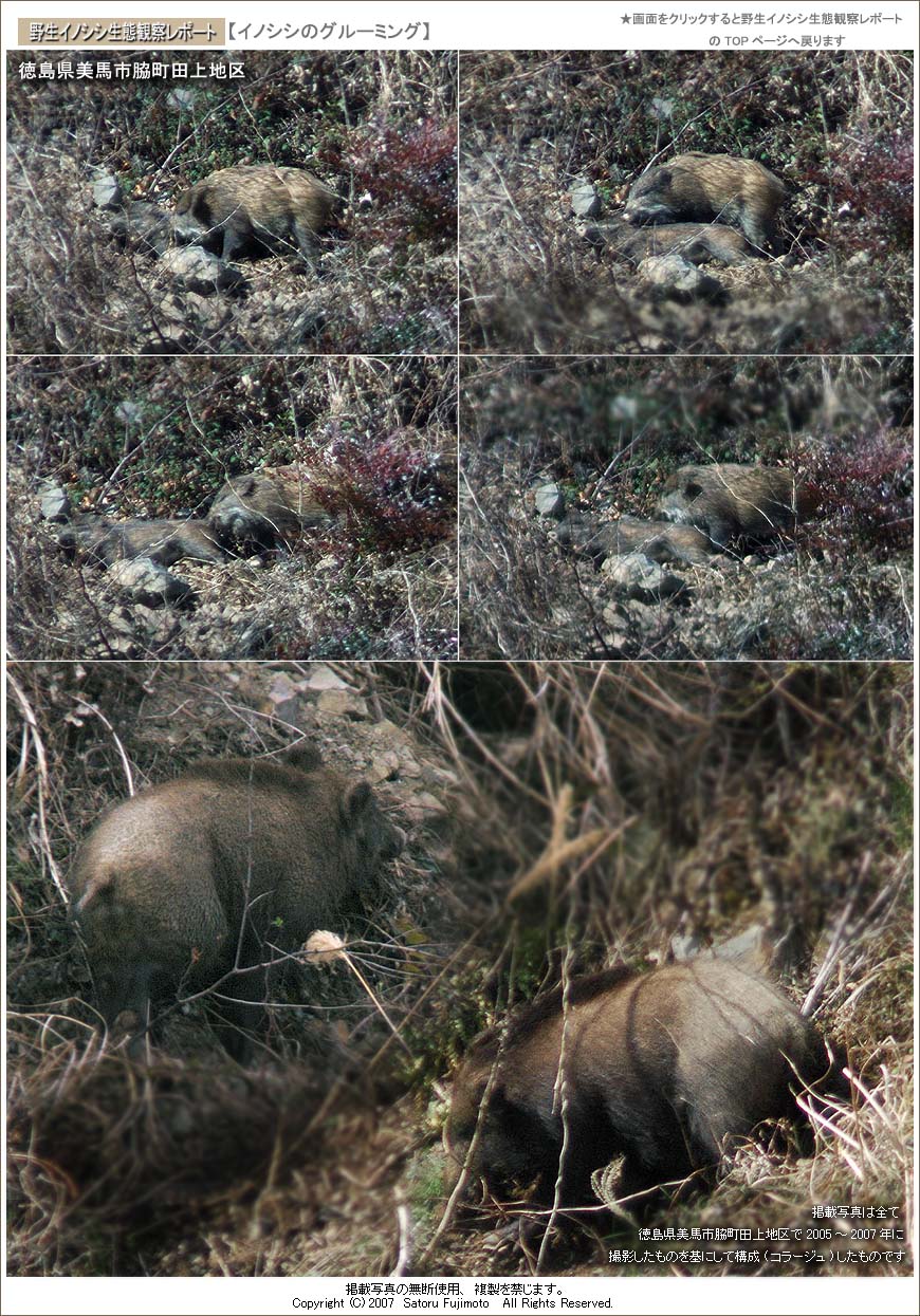 イノシシのグルーミングも他の動物の場合と同じように仲間とのコミュニケーションのひとつであろう。ダニなどを落とすような二次的な効果もあるのかも知れない。