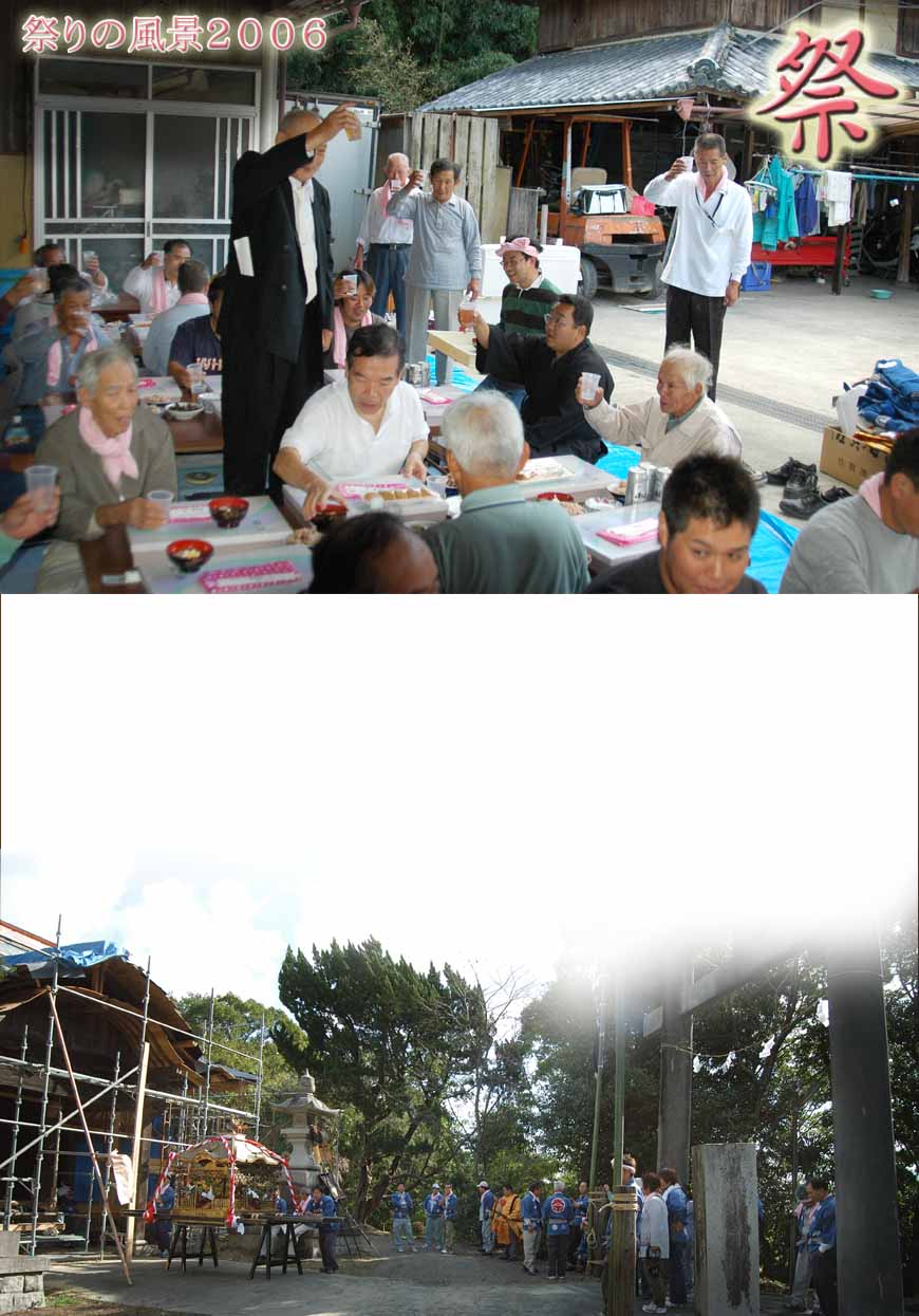 ●2006年10月1日の八幡神社の清掃から、矢来製作、そして10月8日の祭り本番と1週間に及ぶ祭 りの記録であるが、これに先立って9月31日に田上地区集会場に於いて神輿の役割決め、さらに次回