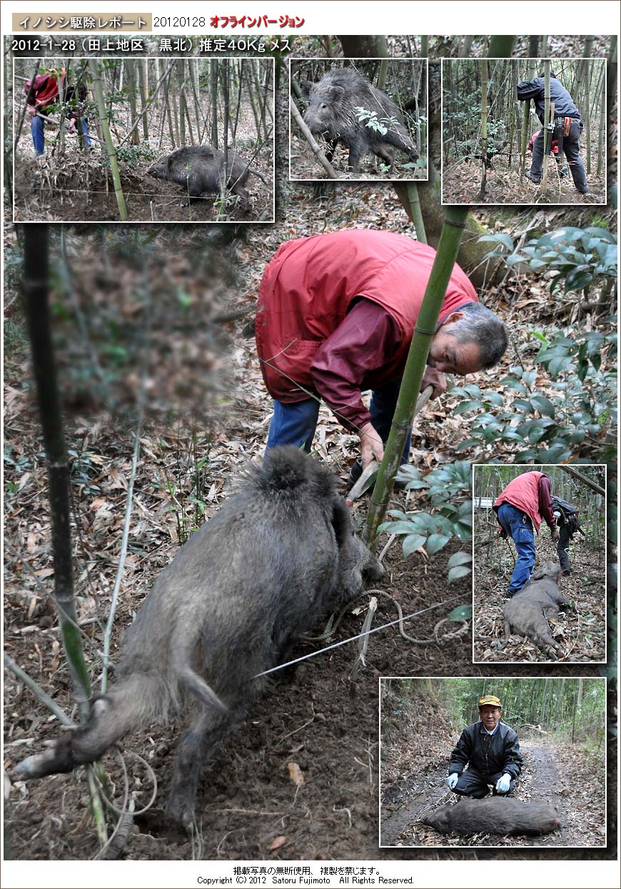昼前に新田さんから「黒北のククリ罠に中型のイノシシが掛かった」と連絡があり、捕獲作業に同行した。新田さんの知人の罠猟師のGさんもやって来た。