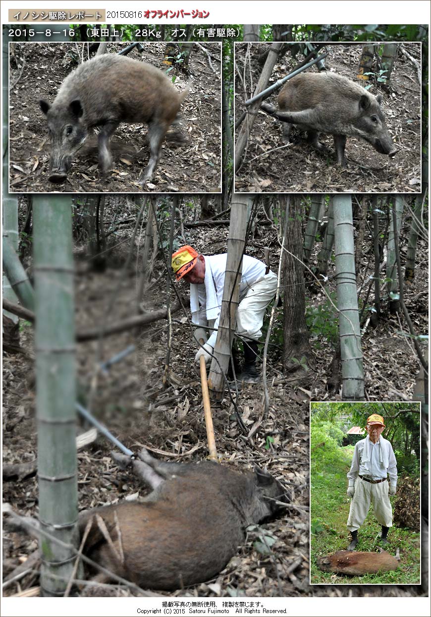 東田上地区内では、一昨年秋に施工したワイヤーメッシュ柵の効果もあって、以前と比べると宇民さんのククリ罠の設置範囲は大幅に縮小している。そのため捕獲されるイノシシも人家に近い場所が多くなり、このイノシシも宇民家の直ぐ裏にある雑木林に仕掛けられた罠に掛かっていた。