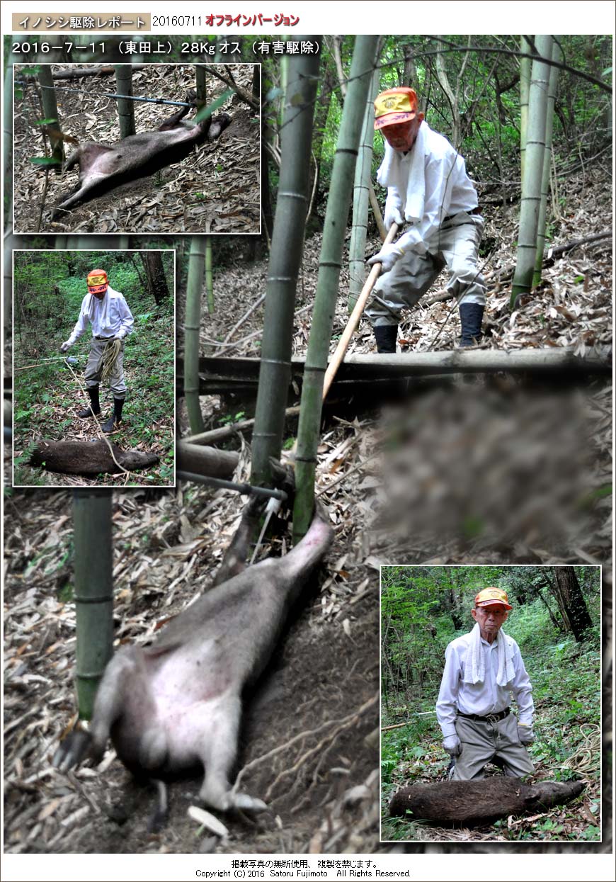 罠に掛ったのは中型のオスのイノシシで、ククリ罠のワイヤーに捉えられた左前足が竹に引っ掛かる形になって身動き出来ない状態で仰向けになっていた。そのためワイヤーで縛る必要が無く、そのまま槍を用いて止め刺しで処理し、滑車とロープを使い山道まで引き上げ回収した。