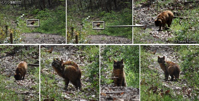人家から離れた山道に、茶色の動物が現れると、一見すると猫には見えない。顔を上げると猫の特徴的な耳の形が目立つので分かるが、下を向いているとなかなか分かりにくいのだ。 以前にも、同じようなことがあった。→→→クリック