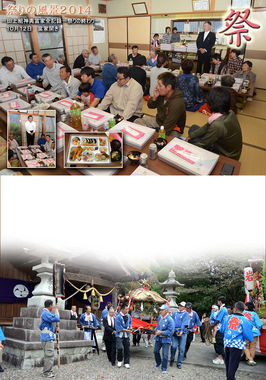 神社では、紅白の化粧を外し担ぎ棒を分解した神輿を倉庫へ収め、境内に立てられた5本の幟(ノボリ)を下ろした。全ての片付けを済ませた後、再び田上集会所へ集まり、午後5時から始められた頭屋開きは午後6時に終了し解散した。