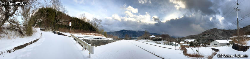 | 日本列島が強烈寒波に見舞われた衆院選投開票日、田上地区でも昨夜からの雪が早朝まで降り続き、道路上でも4センチ程の積雪を記録した。雪は午前6時頃には止み、天気は回復した。 |