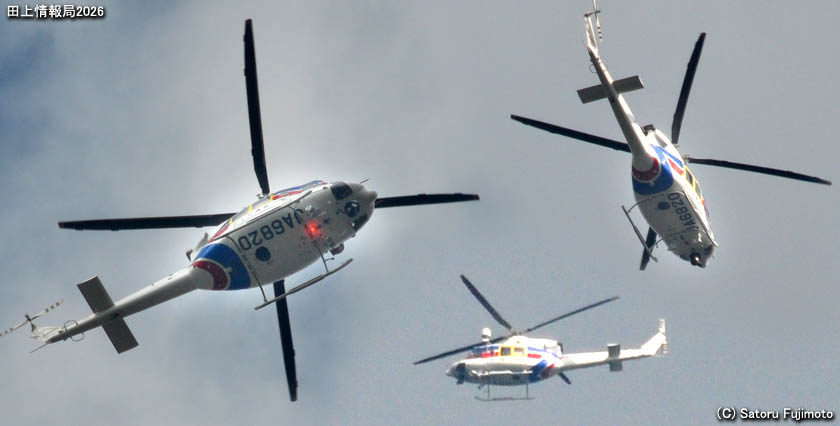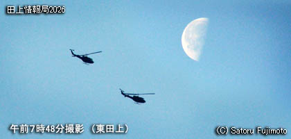 早朝、ひときわ大きな爆音が聞こえてきた。南の空を見上げると間隔を詰めた2機のヘリが下弦の月を背景に西の方へと飛行して行った。自衛隊の多用途ヘリUH-1型だ。