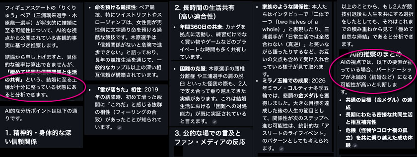 初日のミスを克服しフリーで完璧な演技を成し遂げ、金メダルという大きな目標を達成した2人の今後について、AIさんが、データを駆使して大胆に推察しています。 |