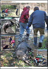 捕獲されたイノシシは40kg位の若いメスで、私が現場へ着いたときには、ちょうど猟友会会長らが電気ショックで仕留めた直後だった。